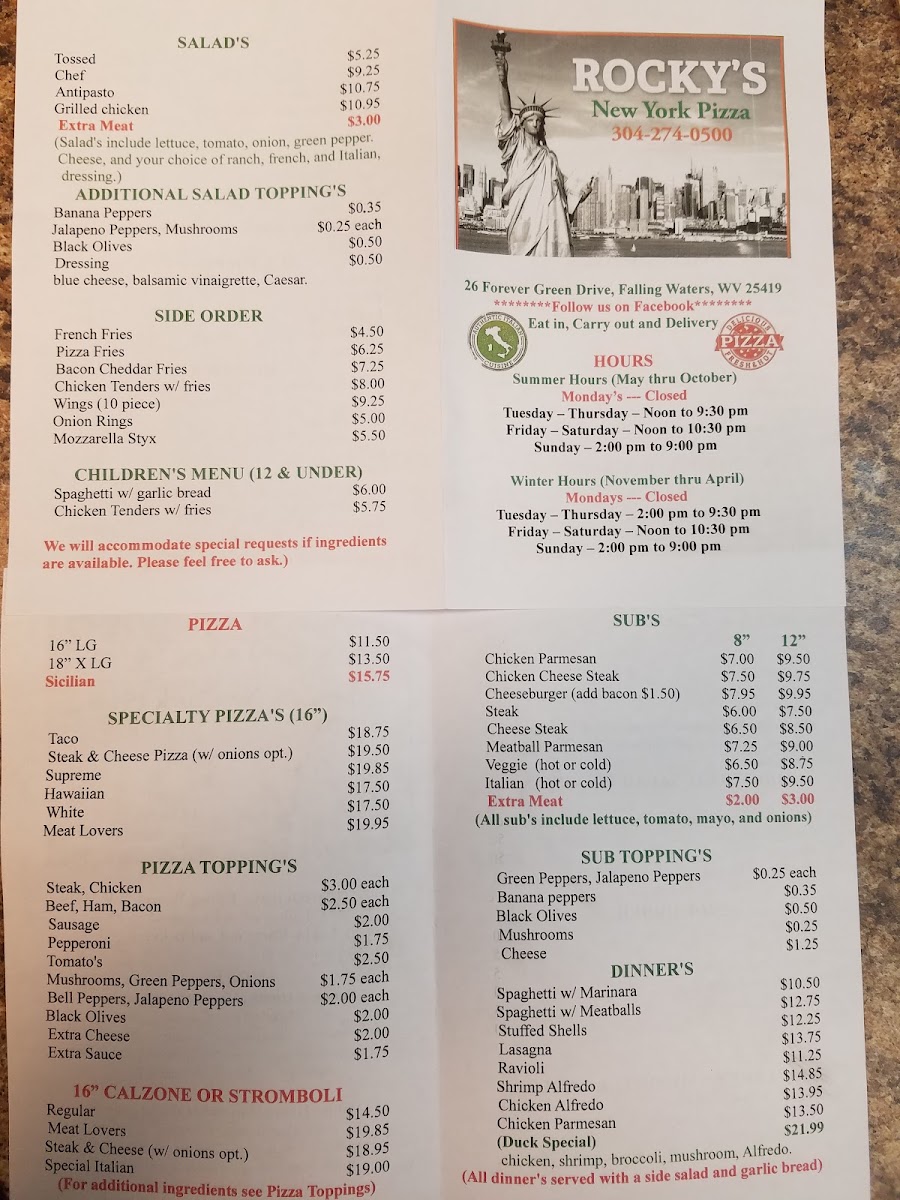 Welcome to Rocky's Pizza, your new favorite spot nestled in Falling Waters, WV. Rocky’s offers an enticing menu that showcases a variety of delightful options, perfect for every palate. Start with fresh salads like the House Salad or go heartier with the Grilled Chicken Salad. The centerpiece, of course, is their unique specialty pizzas—each crafted with top-quality ingredients. From the Taco Pizza to the savory Buffalo Chicken Pizza, there’s something to satisfy every craving.